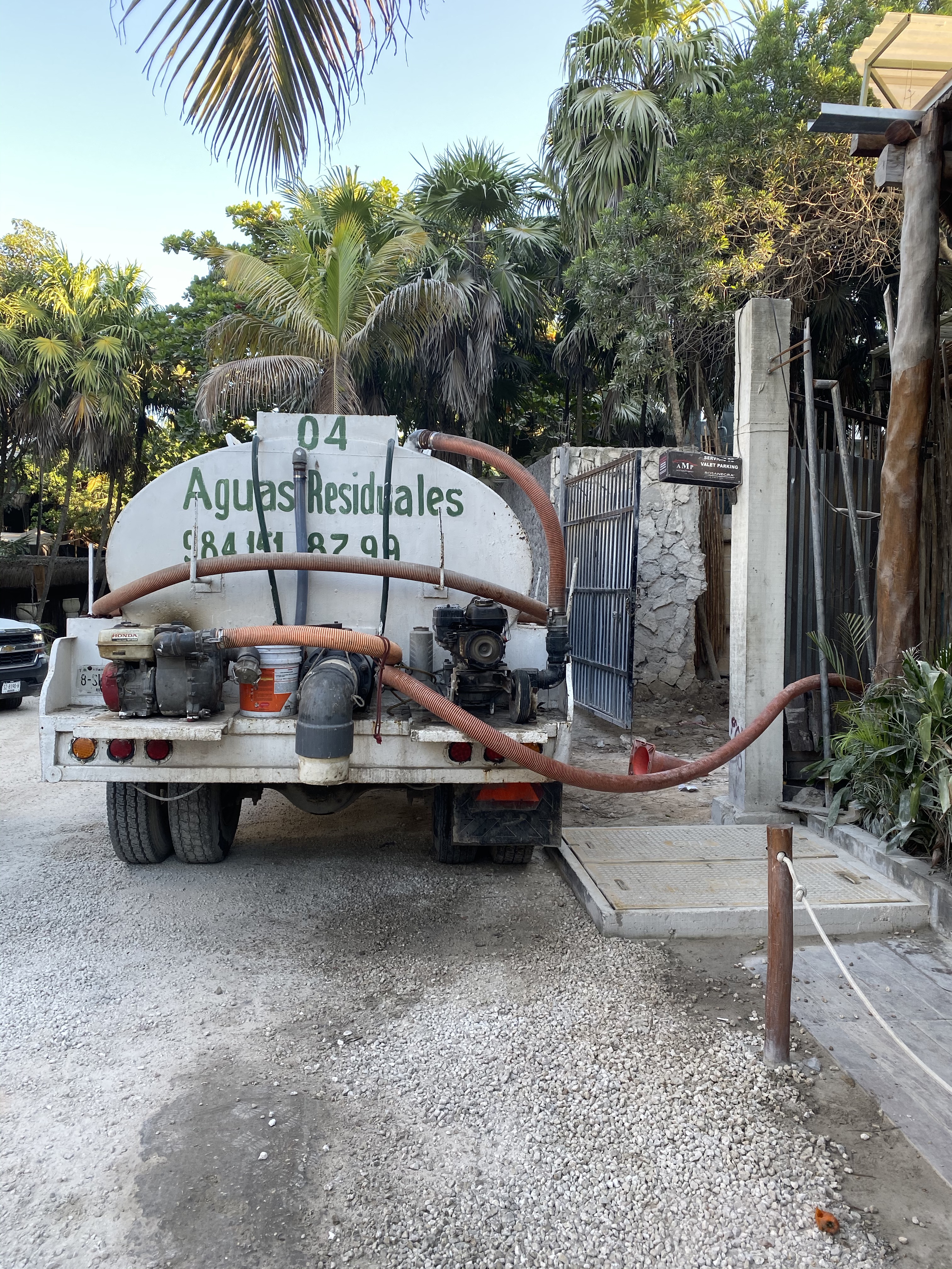 Here’s the thing about water. Nobody really has it. It has to be delivered. Huge water trucks deliver water by thick red hoses to all the businesses. Hundreds of big trucks down THE ROAD each day. Similarly with electricity. The beach is off the grid, so power comes from huge diesel generators some more hidden from tourists than others.